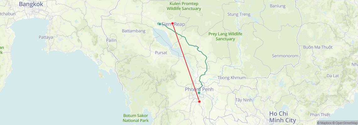 The travel distance between Siem Reap and Phnom Penh is 320 km. There are two options to travel from Siem Reap to Phnom Penh: taking a flight or a bus.